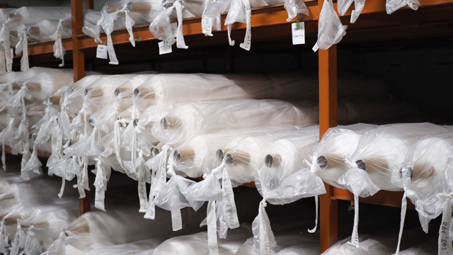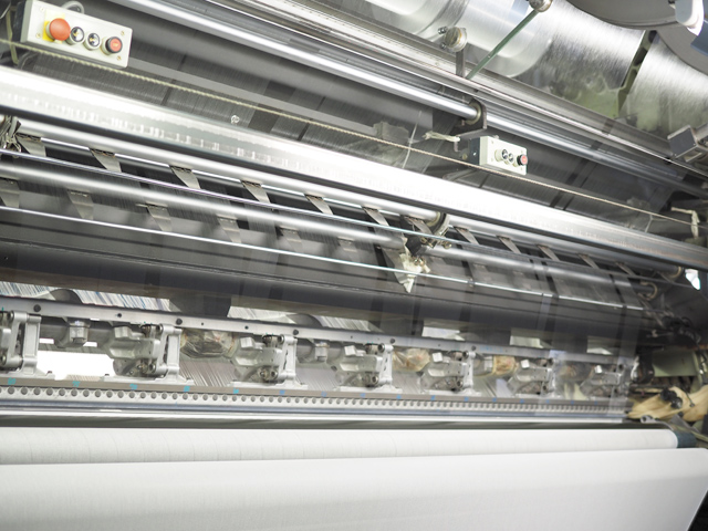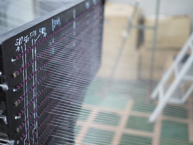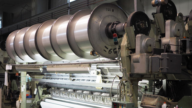 糸がまかれたビームを編機に仕掛け、生地を編み立てます。