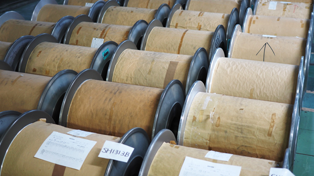 巻き取ったものを数本1セットで使いますが、巻き方が均一な円周・均一なテンションでなければ編まれる製品に傷やムラができてしまうため、回転数、長さ、テンションを揃える必要があります。